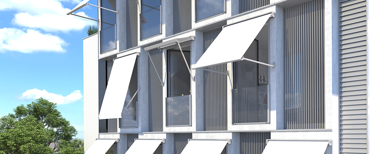 Variante del ST1 Brazo Acodado con Tensión, al que aporta un perfil cofre que protege la lona cuando está recogida sobre el tubo de enrollamiento.