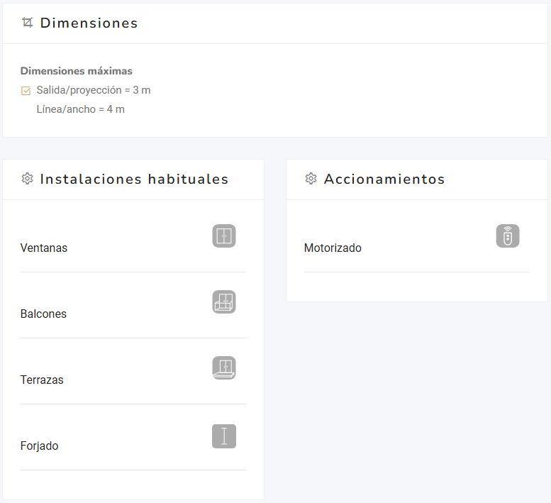 Toldo de amplias dimensiones, ya que cuenta con una proyección máxima de 5 metros y un ancho de 3,5 metros. Este modelo está pensado para su colocación en fachadas.