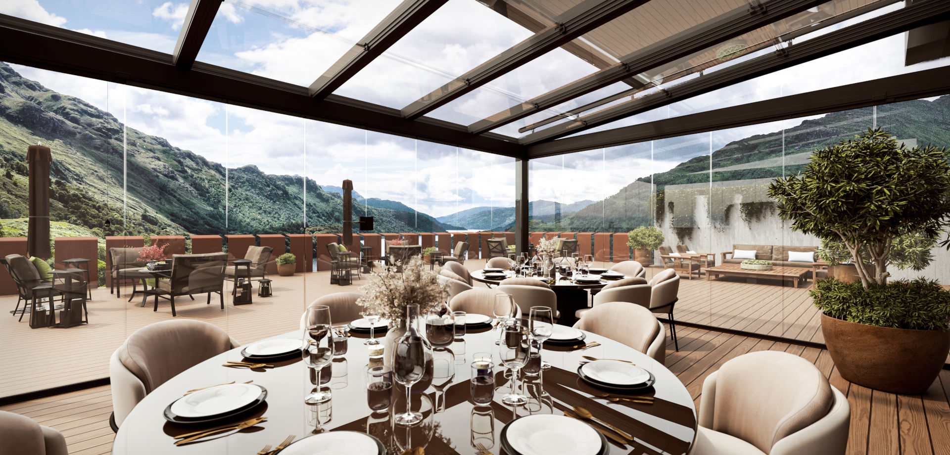 Es una estructura de diseño moderno, compuesta por lamas orientables motorizadas que se adaptan a las condiciones del entorno. Permite controlar de forma inteligente la luz solar, el flujo de aire y la protección frente a la lluvia, todo con un solo sistema. Con solo presionar un botón, es posible regular la temperatura y disfrutar del patio durante todo el año.